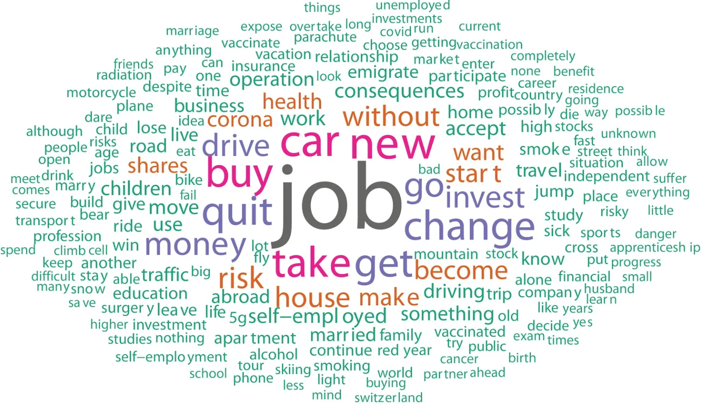 It’s almost comforting. Turns out the thing that unites all of us — across ages, countries, bank accounts — is the shared terror of changing careers. Everyday people in Switzerland sat down, were told “Tell us what risky decision scares you,” and immediately blurted out “new job,” “quit job,” “change job,” “job job job job.”