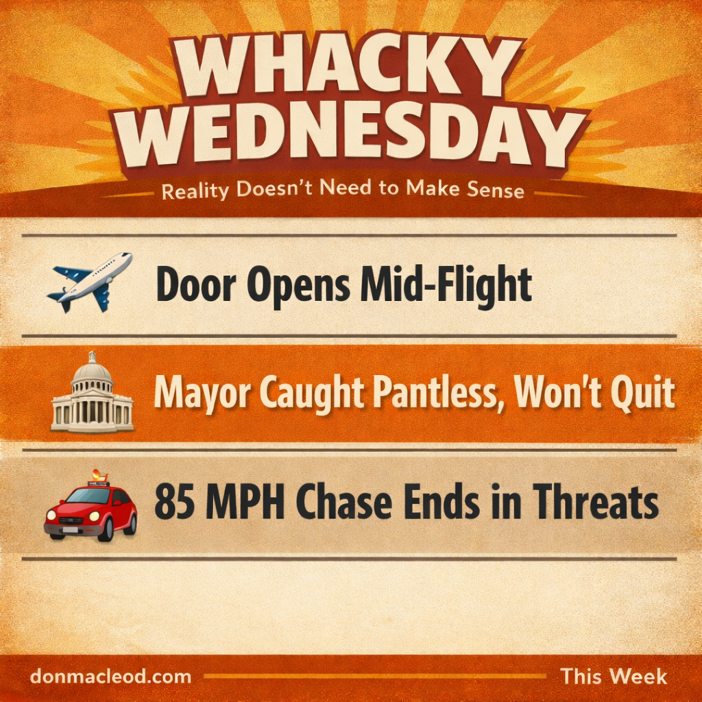 This week: a cabin door that decided altitude was the perfect time to open, a mayor caught pantless on surveillance footage who refuses to resign despite a 4-2 no confidence vote, and a Florida driver who treated an 85 mph chase like a warm-up act before threatening deputies.